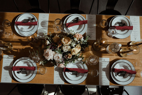 Brier and Ivy's full and luscious floral design beautifully filled the spaces in Cooper's Hall. We loved the climbing floral display on the wine barrels behind the sweetheart table, the hanging greenery that made the space feel more intimate, and color palette mixed with moody and neutral colors. Neutral can often be delicate, but we think the added darkness through the maroon candle sticks and black place cards makes this display all the more interesting.