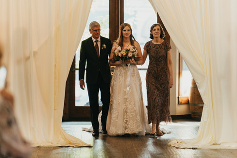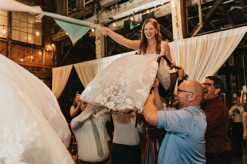 Shoshana and Kristin's wedding was like stepping into an enchanted forest, but in the cozy confines of an indoor venue. The indoor space at SoDo Park is spacious, but has dark, natural wood floors and walls to warm up the space. Stadium Flowers brought the outdoors to the indoors and livened up the space with whimsical greenery. After the ceremony, guests exited the draped center for cocktail hour and we got to work flipping and redecorating the space for their reception. It was a grand reveal when we re-opened the draping!