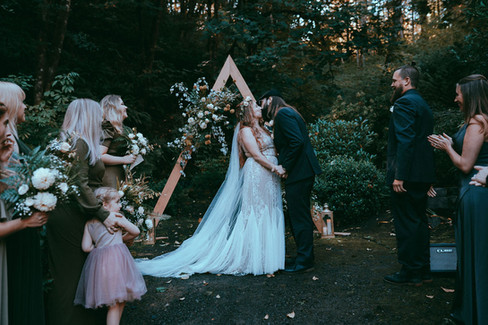 It was a gorgeous October day for this lakeside wedding. Kat and Casey were joined by their friends and family to celebrate their love under a romantic forest canopy. We loved how their flower child style showed through in their design elements like the ceremony arch and table settings, in a way that was both boho and chic.