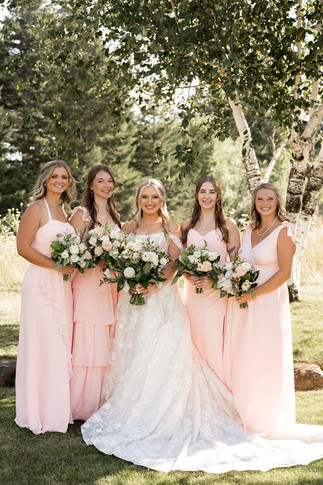 The ceremony took place outdoors, framed by Skamania’s expansive views and a round arbor adorned with blush pink and white florals. The design felt light and organic, with florals featuring a mix of sizes, textures, and movement that added depth without overwhelming the natural setting. Soft shades of pink appeared throughout the day, from the bridesmaids’ dresses to the floral arrangements and subtle decor accents, complemented by touches of sage green and hints of gold that added a refined elegance.