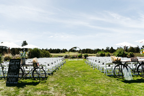 The layout takes guests through an experience: Guests enter through the lodge and then walk the beautiful path along the golf course to the ceremony island (yes, it's an actual island in the middle of the pond). The ceremony island offers beautiful views of the Three Sisters, and a private place to say I Do in the resort. Then, guests move to the ceremony lawn, where Pronghorn offers a beautiful pole tent that's perfect for enjoying the outdoors with the comfort of the shade.