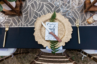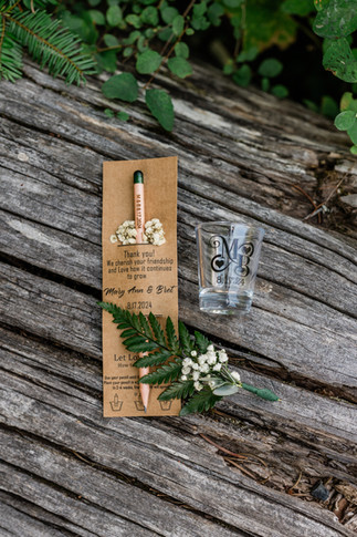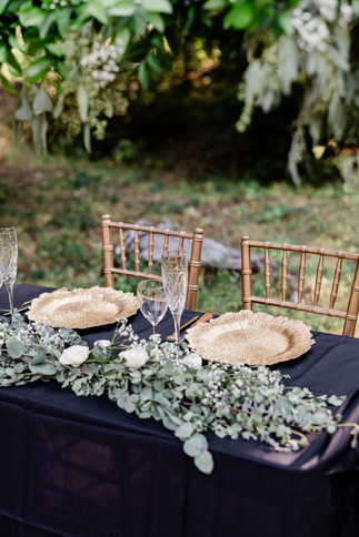 Mixing dark, moody decor and whimsical details makes for a stunning woodland wedding. We absolutely loved Mary Ann and Bret's aesthetic vision for their wedding day. Some notable details were their striking wooden altar piece as well as their gold chargers and funky planter centerpieces as opposed to traditional vases.