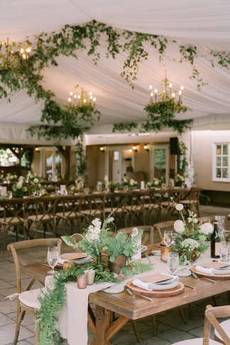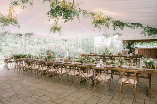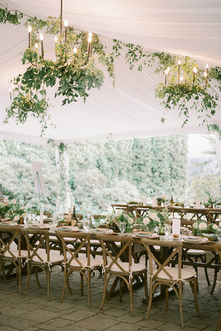 Jenny and Alex's late summer wedding at Chateau Lill had a unique blend of natural beauty and refined style. Being surrounded by the living decoration of lush trees and greenery, coupled with their color palette of green, white, and tans, gave their day an organic feel, while the reception under a tent adorned with greenery and chandeliers added an elegant flair.