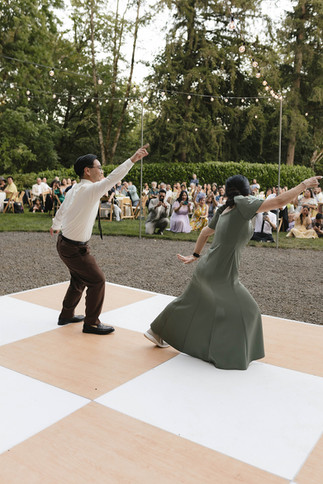 Karli and Evan's whimsical green, mango, purple, and ivory florals dotted the naturally lush landscape and highlighted their retro-inspired decor filled with collected matchbooks and happy houseplants. Their cocktail hour highlighted signature cocktails and an oyster bar while their buffet-style dinner had wood-fire grilled local eats by Rip City Grill and an ice cream truck provided by Fifty Licks. Karli and Evan's day was rounded out by a perfect golden hour glow and a choreographed mother/son dance.