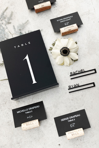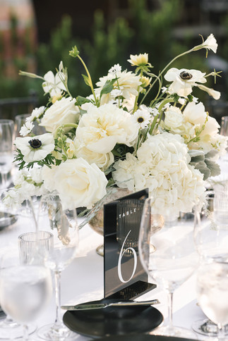 Black and white is the ultimate choice for a timeless aesthetic and Rachel and Ryan's wedding is the perfect example of how impactful it can be. The stark contrast of the clean black plates, table numbers, place settings, and tuxedos were beautifully balanced by the soft white florals, linens, cake, and candles.