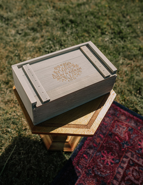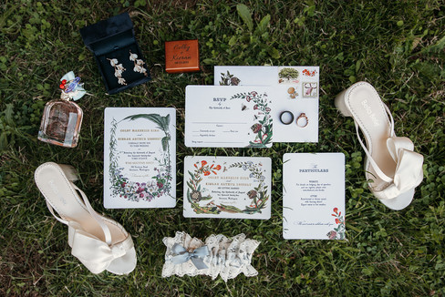 The colors! Kieran and Colby opted for a bohemian, jewel-toned wedding with vintage décor from Great Jones NW. The color came both from the moody and ethereal arrangements by Trellis Flowers and the vibrant rugs the couple rented from Great Jones NW. We even loved how they incorporated the draping and greenery in the tent to give it a softer feel, and really leaned into the the floral details - Colby's suit, the invite suite, the gold-rimmed floral plates.